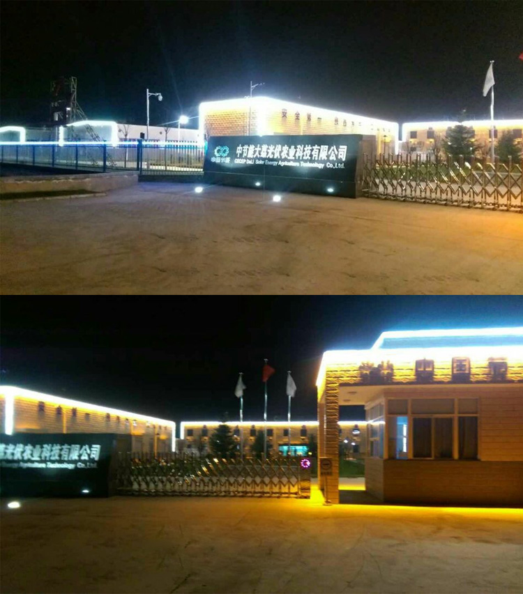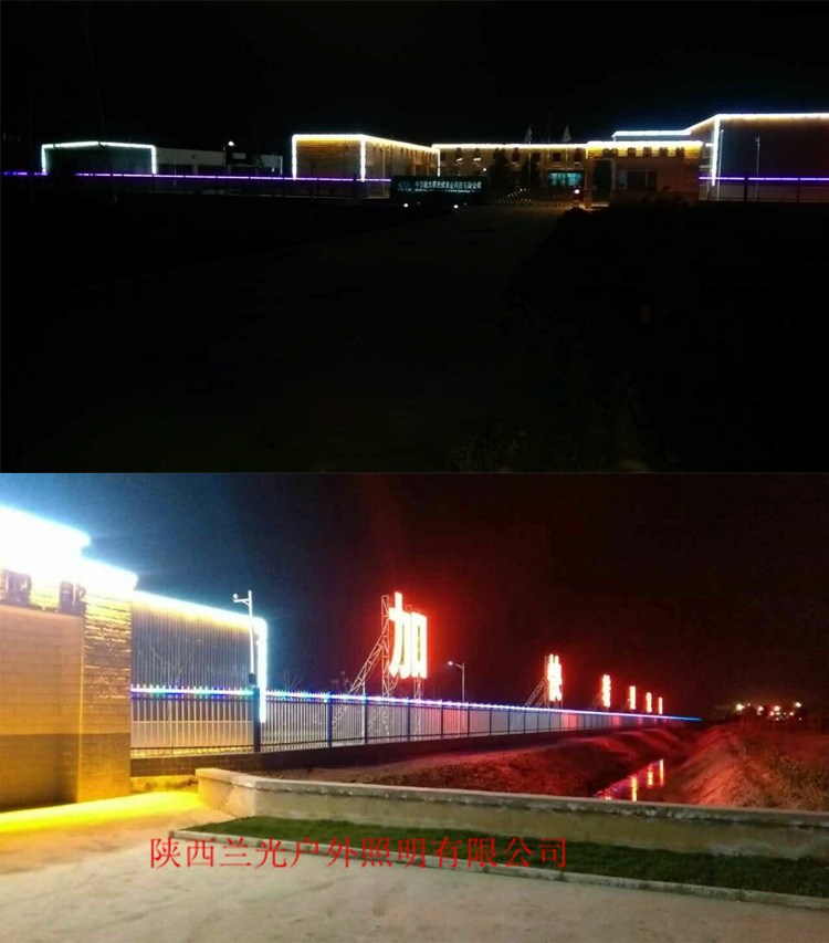 中節(jié)能大荔光伏農(nóng)業(yè)科技有限公司廠區(qū)亮化項目,是我們陜西蘭光照明2015年承接的亮化工程。公司設(shè)計師根據(jù)廠家要求簡單實用的特點,整個廠區(qū)的設(shè)計全部采用線條燈和輪廓燈,將整個廠區(qū)的廠房、大門、廠區(qū)道路、辦公樓以輪廓勾勒的形式展現(xiàn)出來,照亮整個廠區(qū),達到客戶廠區(qū)樓宇亮化需求。