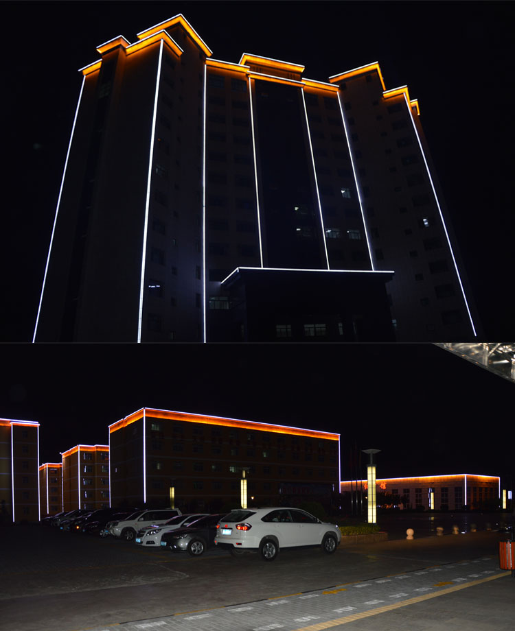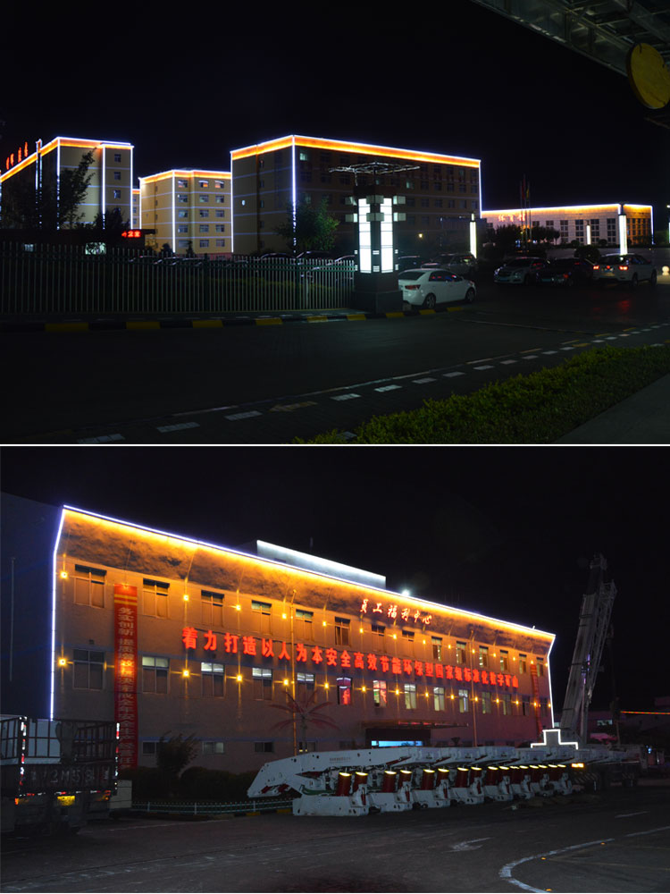 銅川建新煤化是我公司承接的廠區亮化工程之一,該項目整體從設計到施工,全程有我公司承擔負責,設計根據甲方的要求,采用簡潔明了的線條勾勒輪廓和打亮為主。在廠區主要的辦公樓、餐廳、員工活動中心、員工福利中心、員工宿舍樓等員工主要活動的場所樓進行重點亮化。